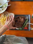 Приехали с дочкой «чисто случайно». И ни разу не пожалели!!! Какие тут обалденные стейки! Ммммм, какие они вкуссссные! И салаты, десерты!! Да тут всё вкусно!! Особенно понравилось,- это меню с выбором стейка (масса указана) и уже , после выбора стейка, можно рассчитывать свои силы на другие блюда. Скажу честно, я и дочь не рассчитали!! Прикладываю фото , где дочь сравнивает размер стейка с рукой!