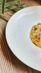 Паста тальятелле, с добавлением бекона, яичного желтка и ароматного оливкового масла. Подается под сыром пармезан.