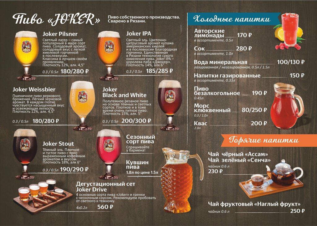 Кухня бесподобная. Вроде все просто, но с душой. Даже фирменные гренки Джокер это красивые треугольные горячие бутерброды, с острым красным соусом и сыром, слегка посыпанные салом. Картофель по деревенски-тоже очень вкусный. Возможно лучший, что я пробовал. Все готовится, поэтому лучше заказывать заранее, или брать пиво и наслаждаться жизнью, пока готовят. Посещал я филиал Алеканово, очень приятный классический антураж. Приятный, общительный бармен. Что касается пива, я рискнул попробовать Ипу и Стаут. Вещи, которые я крайне редко заказываю, но было интересно оценить трактовку. Я не спец в этих сортах, но полтора литра выпил с удовольствием. Вперемежку ;)