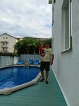 Отдыхали в этом чудесном гостевом доме (буду называть отель) с женой, в конце августа - начало сентября. Если вкратце, то отдых был просто супер! Если развернуто, то так: очень отзывчивые хозяева Владимир и Юлия, всё расскажут, покажут и решат любые проблемы; Галина Владимировна накормит от души своими очень вкусными блюдами, а Борис предоставит Вам трансфер от вокзала или поездку на пляж и прочее. А теперь, ещё более развернуто :-) Отель, хотя и не большой, но очень комфортный, всё сделано с душой! Уютные номера, всегда есть горячая вода с сильным напором (у отеля скважина, на сколько я помню, порядка 70 метров и вода, по запаху, как минеральная, не пугайтесь, ничего в этом плохого нет, спокойно чистили зубы и мылись, проблем никаких не было). Отель чистый, белье и полотенца свежие, туалетная бумага всегда была, но мы по привычке сразу купили свою :-) . Отдыхали 6 ночей, уборку провели на 3й день, но это и не страшно, так как пляж галечный и в номер песок не носится + при входе на территорию, есть кран, где можно обмыть ноги, это касается и перед посещением бассейна. В отеле есть прачечная, место для сушки и общая кухня с большим холодильником. На кухне весь необходимый инвентарь (для не требовательных "господ" более чем подходит) для приготовления пищи и мойки посуды присутствует. От отеля до пляжа, 10-15 минут пешком, по прямой. Очень радовало наличие хотя и не большого, но очень чистого бассейна (Владимир каждое утром производил чистку и по мере надобности работал со спец хим средствами для бассейнов), а так же, удобных шезлонгов. После полуденной дороги с пляжа, было очень приятно окунуться в освежающий бассейн перед обедом! Что касается питания в данном отеле, то - это просто овации! Да, завтрак постоянно повторяется, но Вы никогда не будете голодными точно (молочная каша, творог, оладушки со сгущенкой или сметаной, отварные гречка/макароны (с добавлением сливочного масла) с сосисками, нарезки колбаса/сыр/овощи, хлеб/батон, сливочное масло, яичница с беконом или зеленью, печенье, чай/кофе, молоко. На обед, каждый день новое меню, состоящие из: первое (всегда на мясе, очень наваристо и сытно), второе (гарнир + мясное), овощной салат и компот. Мы брали полупансион, где обед включен в стоимость и ниразу не пожалели! Отдельно обед стоит 500р на человека. Галина Владимировна, Антон и Марина, Вам передают отдельный привет и огромную благодарность! +3кг позитивного веса было набрано :-) Так же, если остаетесь на длительное время, советуем приобрести у Владимира или Галины Владимировны питьевую воду, чтобы не носить с магазина - бутыль на 20 литров с помпой (вода фирменная, местная, очень хорошая), всего 350р. Мы пьем много и за 6 дней ушло 2 бутыли на двоих, это с учетом налить в чайник и что-то сварить в кастрюле. По инфраструктуре: рядом есть небольшой магазин, столовая и колоритное кафе дача. До пятерочки (рядом КБ) пройтись минут 10 или на такси (150р). По дороге с пляжа, есть ларек с шикарными сырами и сладостями. После дороги с пляжа, если пройтись чуть на право, то будет магазин с вкусной колбасой и копченым сыром, далее от него будет мясной магазин с шикарной вырезкой, шеей и прочем, ещё чуть дальше от него, отличные овощи по доступной цене (это всё 1-3 минута ходьбы от дороги на пляж, район остановки "Смена"). Прямо на светофоре после пляжа, стоит ларек с мороженым, пломбир в стаканчике,