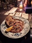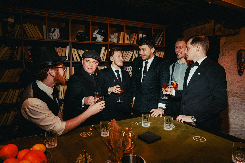 Попали на ковёр в кабинет и ушли довольные (и на своих ногах) . По порядку: 🎹 Атмосфера. Попадаете во двор где-то за Елисеевским и петляете по колодцу минут десять, пока не понимаете, что одинокая деревянная дверь без опознавательных знаков и есть вход в заветный подвал. Внутри вас ждёт эпоха сухого закона, сводчатые кирпичные потолки, рассадка под покерные столы и стильные бармены в галстуках и шляпах. Часам к десяти начинает играть живая музыка, тк что любителям джаза хайли рекомендед. 🥩 Еда. Скромное меню, заточенное под закуски, что и понятно. Тар-тар из краба (1200 рэ) прекрасен, Женя впервые попробовала краба. 🥃 Коктейли. То, за чем мы здесь. Коктейльная карта разбита на четыре стихии, в каждой из которых есть колода карт с кратким описанием напитка. Бармен наугад выдаёт вам три карты из выбранной стихии. Некоторые напитки могут повторяться, и лол кек случается, когда тебе выпадает три карты одного и того же коктейля. Вежливый бармен может предложить Вам и другой напиток, но такая игра с судьбой-фатумом-роком определённо интереснее. В целом подбор коктейлей - это твисты и интерпретации хорошо знакомой классики, но есть и уникальные вещи. Средняя цена чуть выше по местности - 950-980 рэ. Итого: тайным баром сейчас, конечно, уже никого не удивишь, но это всё ещё отличный повод потешить своё эго причастностью к месту "для своих". Коктейли вкусны и прекрасны, но будем честны - большую часть денег вы заплатите не за них, но за антураж. А он тут крайне хорош