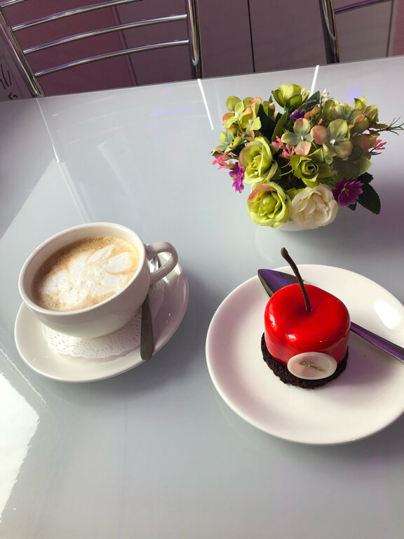 Место очень понравилось, приятная обстановка, чисто и вкусно. Пирожные очень красивые, а самое главное вкусные. Я брала кофе по венки и пирожное сердце, муж брал рафи и пирожное Наполеон. Всё очень было нежное и воздушное, в моём пироженом под твёрдой корочкой был нежнейший мусс и малиновое пролине. Наполеон нежный и не приторный, в раф не пожалели малиновый сироп. Нас обслуживала приятная девушка вежливо объяснила состав пироженных и помогла определиться с выбором. По моему мнению место заслуживает высшей оценки.