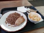 Если у вас есть с собой Доширак и примус, лучше воспользуйтесь ими. Если голод застал в дороге, то здесь его утолить можно. Но еда будет невкусная и холодная. Её засунут на 10 секунд в микроволновку, керамика нагреется, но еда нет. Большой очереди бояться не нужно, столики освобождаются быстрее чем люди доедают. Заметил, что многие берут просто макароны, без мяса и котлет. Возможно просто совпадение.