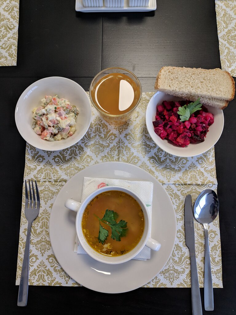 Простенькая столовая. По виду из советского прошлого. Собственно, поэтому выбор и пал на неё. Яндекс обозначил самый маленький средний чек 300 р. Есть, где припарковаться. Чисто, но уюта,- никакого. Экран TV весь мой обед орал какие- то непонятные песни. Для чего это делается? Чтобы пропал аппетит? Чтобы быстрее заканчивали "прием пищи"? Качество приготовления на отлично. Но! Небольшой ассортимент(зашёл в 12-00,- обеденное время ещё не началось). Один вариант супа, правда на отлично. Гарнир,- рис и макароны,- троечка. Горячее,- выбор был от котлет, - до шницеля. Без рыбы. На хорошо. Салаты 3-4 варианта. Хорошо. Напитки,- два варианта + чай. Хорошо. Цена за борщ, шницель с макаронами, салат летний(самый дешёвый)+ напиток- 500 рублей! Есть санузел, но без возможности вытереть, или высушить руки.