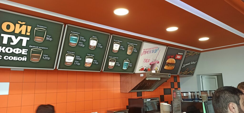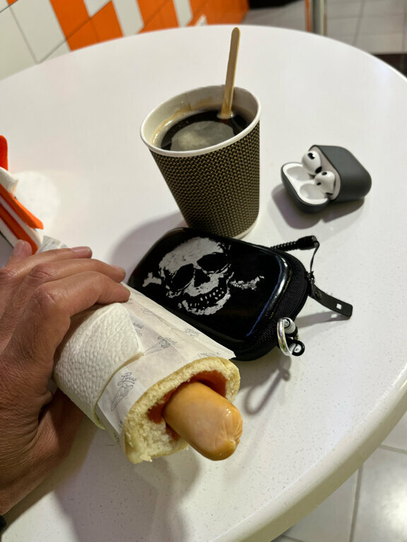 Отличное место для перекуса в дороге. Горячие хот доги и кофе. Цены на фото видны.