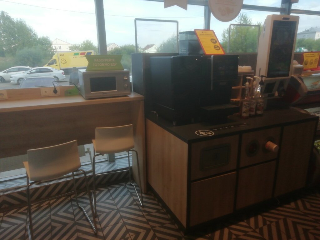 Приветливый персонал, приятная атмосфера, нет очередей, вкусная выпечка, можно приобрести готовые блюда, даже первые и вторые. Можно разогреть, есть микроволновка. Кофе отменного вкуса, вкуснее чем на заправках. Советую всем.