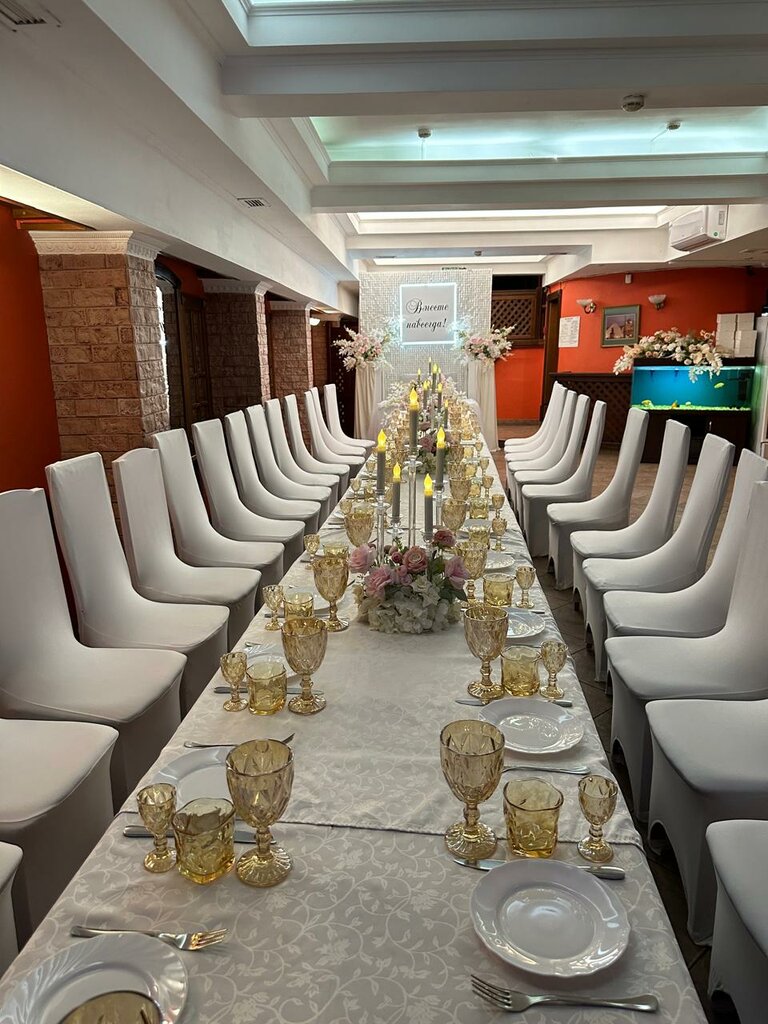 Справляли свадьбу у племянника. За оформление зала отдали 10.000. Это скатерти, чехлы на стулья, стол молодых. Думаю дороговато! Скатерти и так были бы. Сами заказывали аэродизайн. Стол был вкусный. Меню разнообразное: салат, нарезки, горячее, рулетики, курица, бутерброды и много ещё чего. Оригинальный торт! Повара постарались, СПАСИБО! ДЕВОЧКИ ОФИЦИАНТЫ обслуживали чётко, быстро, не мешая. Рекомендуем!