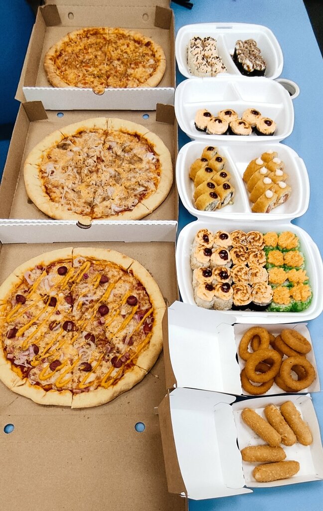 Variety of food:sushi and rolls, pizza