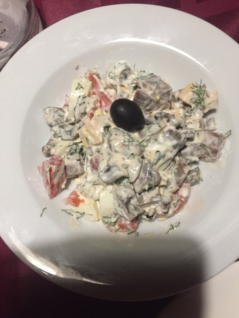 The signature salad "Sabo" surprised (250 grams)...((( I expected something delicious for 100 UAH, but it's not...pieces of cheese product, boiled eggs... I coveted beef tongue, fried mushrooms....There was a language...There were no mushrooms...