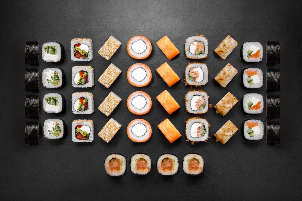 Variety of food:sushi and rolls, sweets, pizza