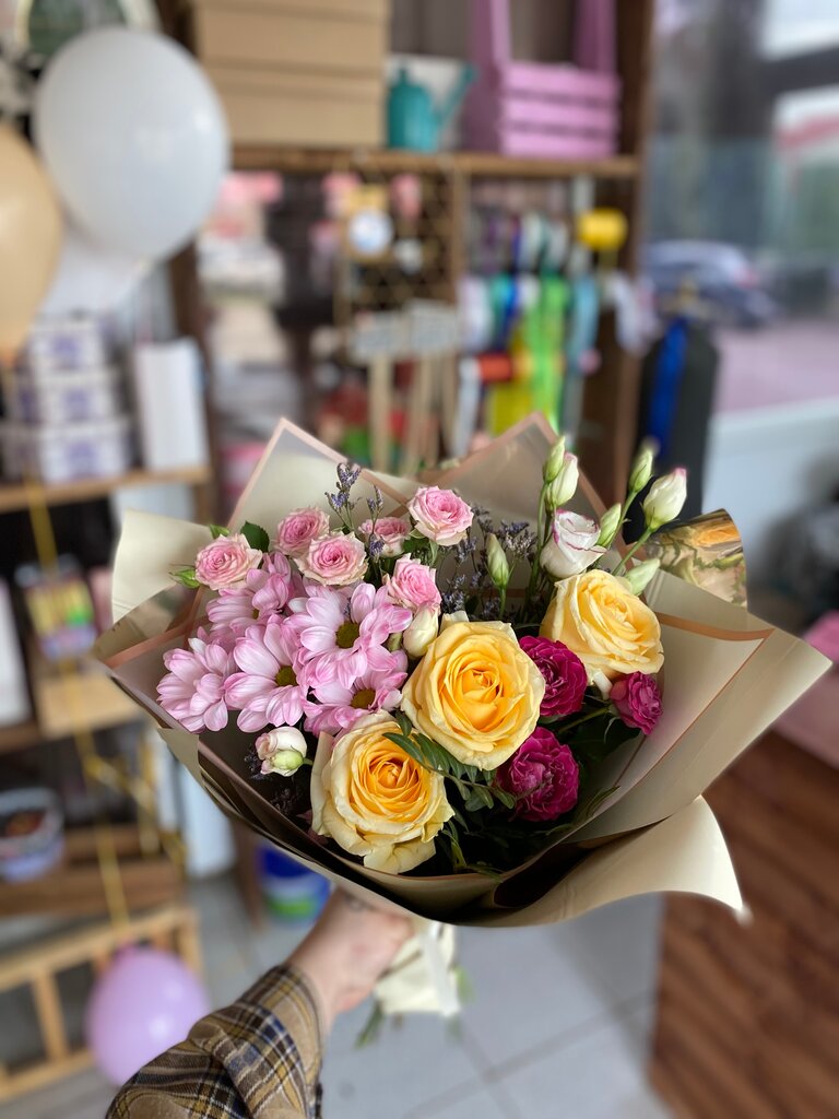 Свежие цветы. Отзывчивые сотрудники. Собрали красивый букет для сестры на юбилей.