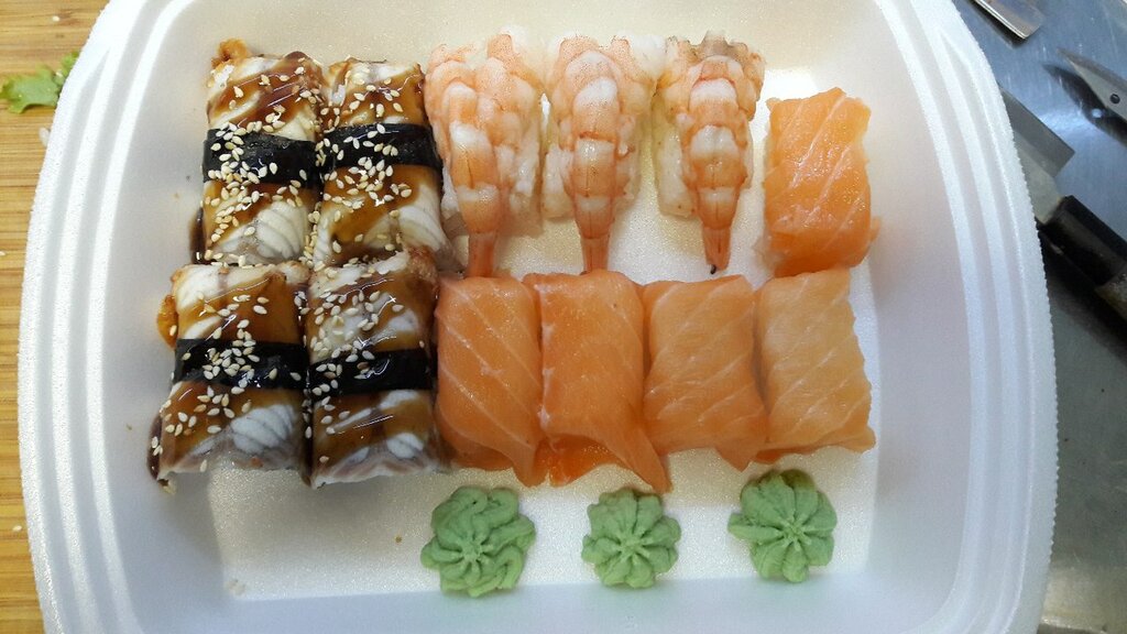 Variety of food:sushi and rolls, сhinese food