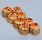 Крем-краб, майонез, огурцы, зеленый лук, кляр темпура, кунжут юдзу и умэ, аонори
