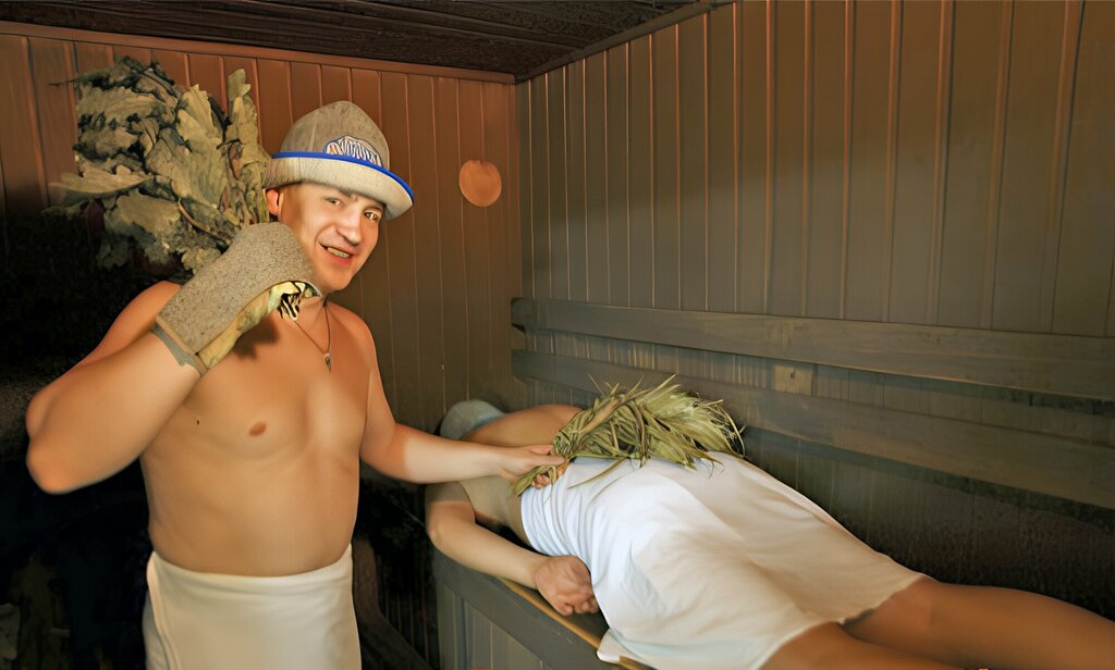 Парение двумя дубовыми вениками (1 заход)