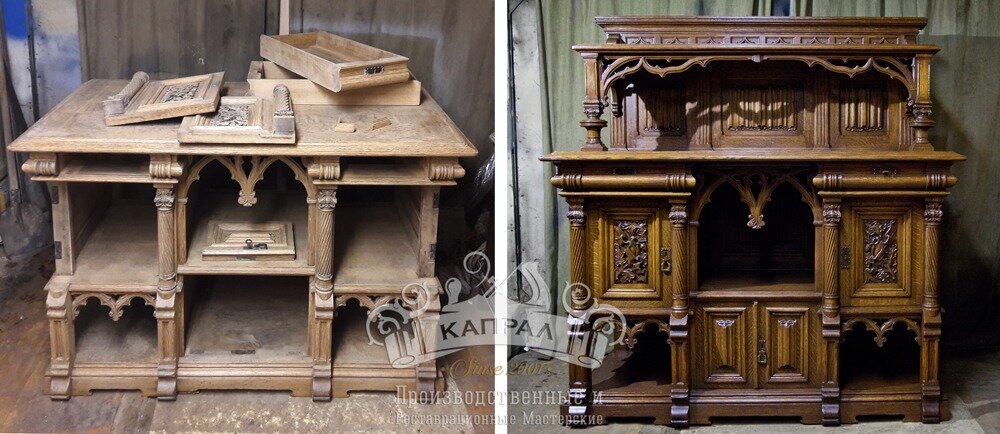С Алексеем и мастерской Капрал мы знакомы с 2006 года.Сначала он виртуозно отреставрировал повреждения на современной мебели, а впоследствии не раз давал вторую жизнь антикварным предметам мебели.Здесь поделюсь историей семейной реликвии- буфета, который принадлежал моей бабушке. Буфет старел на глазах и вызывал острое желание ему помочь.Наш Мастер забрал его на время в свои золотые , умелые руки-колдовал, лечил, снимал слой за слоем неумолимые следы времени- и вдохнул в него новую жизнь! Теперь наш старый друг буфет весело отражает солнечный свет и радует новые поколения семьи своей историей и красотой!