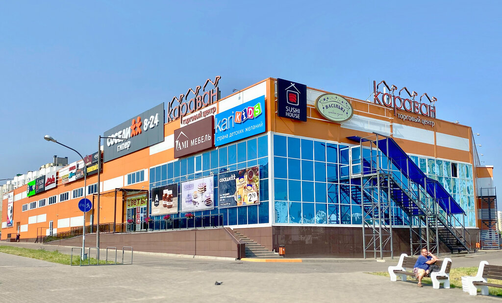 A cozy small-format shopping mall. Inside there is a large supermarket "Neighbors" with good cooking and always fresh food. I've never seen a delay here. There are also shops in the mall such as mila, Mark formel, svitanok, fix price, stop price, three prices, Marko's shoe store, galantey bags and accessories store. There is also a Cornflower Belarusian cuisine restaurant and a sushi house on the second floor. As well as excellent and spacious parking at this shopping center.