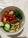 Нарезка в салатах как тапором порубили. Отвротительно. Хлеб непропичен. Раньше было лучше. Испортили лавочку. Уже прошло два месяца а изменений нет. Также осталось.