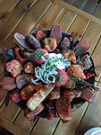 Заехали с супругом и собачкой Корги на обед. Кухня заведения не предусматривает наличие рыбных блюд, что мне не мясоеду сразу не понравилось)) Супруг заказал шашлык свиной и говяжий, сыр брынзу, лаваш, соус, чай с чабрецом. Шашлык из свиной шеи был суховат, говяжий на кости супругу понравился. Я же жевала вкуснейший лаваш, макая его в красный соус, вкусненько. Но самым волшебным оказался чай с чабрецом, рекомендую, он бесподобен. Обслуживание: на весь ресторан одна девушка официант, грубовата, но, видимо, иначе ей быстро всех не обслужить… мы сидели на веранде, довольно сыро и зябко, сама по себе конструкция серая и мрачная. Питомцу конечно же водички никто не предложил, спасибо, что вообще с животным пустили поесть)).