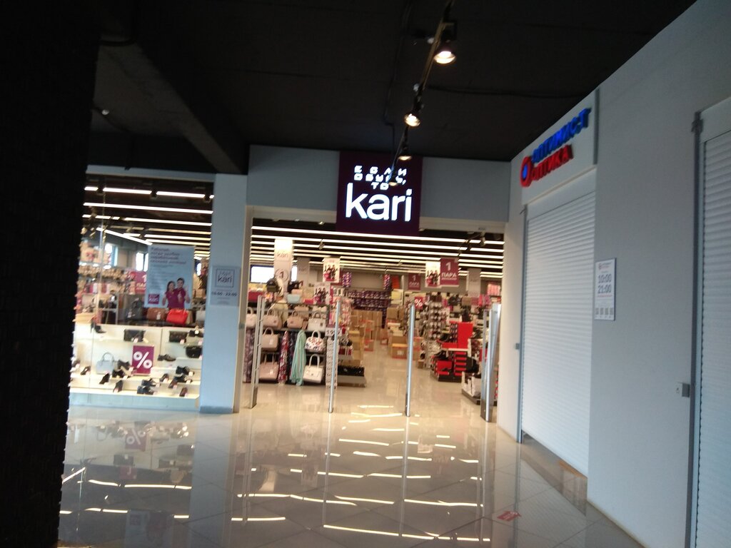 Ассортимент обуви большой, в зале тесно, примерять обувь крайне не удобно, но! Чисто, консультант в зале быстро помогла. А вот на кассе начались трудности. Кассир явно в плохом настроении хамила, касса зависала, подошла ещё одна работник и не пыталась даже извиниться за хамящую коллегу и сложившуюся ситуацию. Результат - ушли без покупки. Но это только в этом отделении Kari произошло. В многих магазинах Kari совершали покупки без проблем.