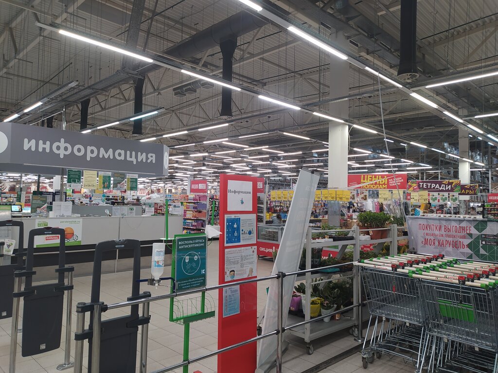 Была впервые после длительного карантина в гипермаркете "Карусель". Впечатление? Выбора св. рыбы никакого... В овощном отделе св. капуста не приведена в приличный товарный вид, овощ побит, а верхние листья никогда не обрывается рабочим персоналом. Жареный миндаль лучше фасовать в различную объёмом пластиковую тару с крышкой и вес делать ровным, а не на подложку. И Зелень зачастую продаётся очень большими пучками в упаковке (кульке). Такой вес: 50-120-150 гр. купить сложно, а покупатели разобрали бы быстрее небольшие объёмы зелени, кому мало, возьмут две упаковки. Просите поставщиков св. зелень фасовать небольшими объёмами. Раньше можно было купить зубной порошок, сейчас не видела. Продавцов в зале мало, спросить о чем-либо некого. А в общем: чисто и стало больше порядка. Сама много лет работала продавцом и недостатки сразу замечаю. Удачной торговли!!!