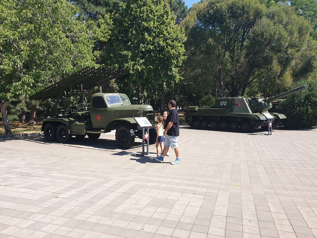 Экспозиция военной техники код открытым небом. Очень радует возможность полазить, потрогать и сфоткаться. Всего где-то 15- 20 экспонатов( пушки, танки, БТР, БМП). Ещё неподалёку есть ещё и подводная лодка. Не везде такое увидишь.