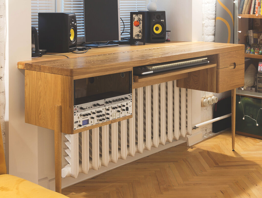 Стол сделан из массива дуба и покрыт специальным маслом для столешниц на основе твердого воска, выдержит даже пролитое вино или горячую чашку с чаем. Ящики установлены на направляющие скрытого монтажа, их не видно, а лючки для доступа к проводам ф