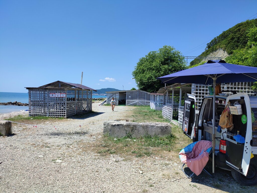 Хорошее место, почти всегда свободно, можно подъехать к морю (даже на переднем приводе, т.к. небольшой скат и крупная галька). Если пройти в сторону города, то галька на пляже становится меньше и местами песок. Стоимость проезда на пляж для купания 150р. для проживания с ночёвкой (сутки) 400р. (на июль 2025 г.). Заход в воду через крупные скользкие камни (лучше в шлепках), но вода очень чистая, прозрачная и теплая, есть крабики и пару раз видели дельфина.
