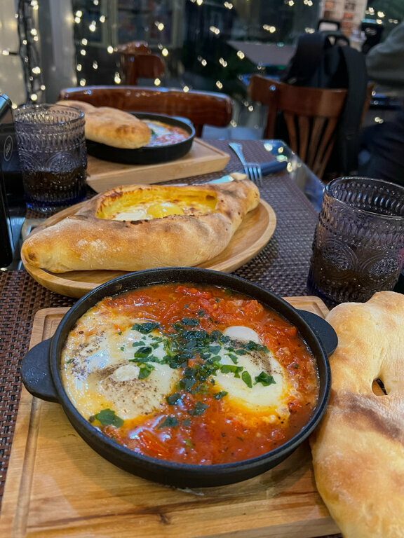 В целом все хорошо, шакшука, маленькое хачапури и чай фруктовый вышли в 860 руб. Хачапури среднее, сыр был очень соленый, шакшука обычная, чай сначала сделали холодный, но попросив переделать, девушка все переделала. Внутри кафе маленькое, но уютное, есть столики на улице, единственное достают голуби, которые садятся прям на стол!