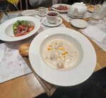 Есть свободные места даже вечером в субботу, собственно, потому и приехали поужинать. Хачапури по мегрельски с двойным сыром вкусный, без нареканий. А вот сациви никуда не годится: курица сухая, а соус бажи слишком жидкий. Не рекомендую. Дочери понравился молочный коктейль. На десерт шу с кремом, очень вкусный. Обслуживание очень приятное. Обстановка уютная. Цены средние по Москве. Есть акции каждый будний день, на фото указала.