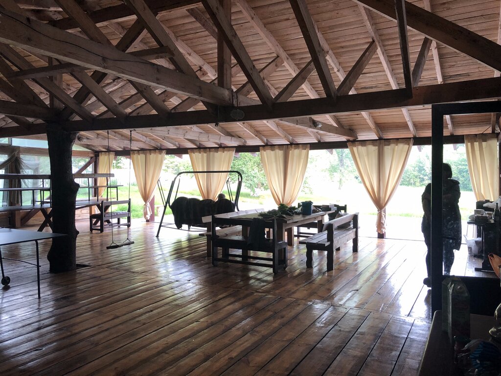 Nice, quiet place. There are locations of rare Soviet-era equipment. There is a parking lot. 100 people in the banquet hall, free. The service is not intrusive, everything is on time and hot, drinks and dishes. Serving on the level, fruits and dessert are on fire. There is a toilet (seen only on the street) equipped... There are forest trails for walking. We will recommend it. Yes, the Internet is weak, you need to search. But on vacation, the Internet is not the main thing)))