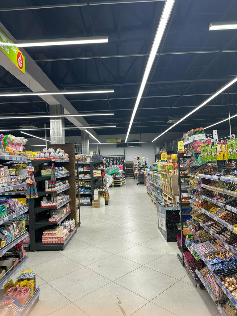 Универсам большой с хорошим ассортиментом товара. Есть и продукты и бытовая химия и хозтовары. Большой выбор кондитерских изделий, широкий ассортимент молочной и мясной продукции. Брали хлеб (в форме калача) с добавлением семян - остались довольны, вкусно. Работают 2 кассы - одна производит обслуживание покупателей с наличными, другая - по карте, либо при помощи QR-кода. Кассиры работают быстро, вежливы. В этом же здании есть аптека. Оплата наличными либо переводом. Из магазина можно пройти в кафе. Впечатление хорошее.