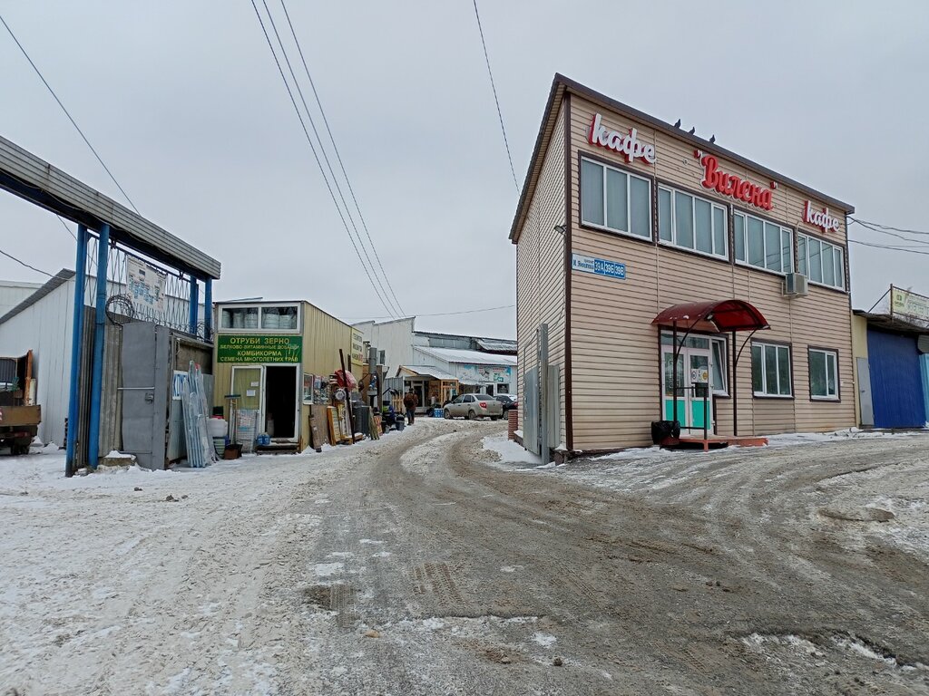 Относительно дешевый строительный рынок. Электрика, сантехника, штукатурные смеси, все для бани, пиломатериалы, доски, брус. Есть магазин "светофор" на территории. Есть парковочные места. Есть кафе.