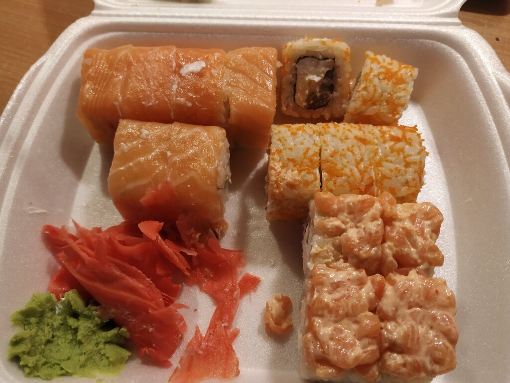 Сегодня посетили данное заведение, хотели посидеть покушать, но, войдя, желание пропало. Интерьерчик удручающий, в стиле 90-х. Тем не менее решились заказать еду с собой, выбрали запечённые мидии и запечённый мини сет (за 440 руб!!! очень дёшево). Заказ вынесли через 20 минут, как обещали. Запечённые мидии вроде ничего, есть можно, но мини сет разочаровал. Роллы довольно маленькие и их много, начинки, соответственно, тоже мало. Вкуса роллов вообще не чувствуется, будто ешь безвкусную рисовую кашу. Соевый соус разбавленный водой, тоже безвкусный, впрочем как и имбирь. В общем, если хотите набить желудок рисом, то можете зайти на огонёк в данное местечко.