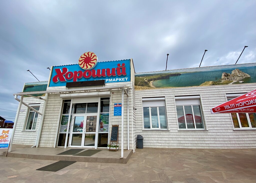 Супермаркет находится в пешей доступности от любой точки Хужира. Ассортимент товаров заслуживает уважения, особенно для такого небольшого помещения. Товары качественные, просрочки нет. В супермаркете выпекают хлеб, очень вкусный. В нём 2 кассы, но если людей слишком много — то можно пройти на сувенирную или алкогольную кассу, где товар также пробьют, но на них лучше взять бумажный чек. В общем, магазин "Хороший" и вправду неплохой.