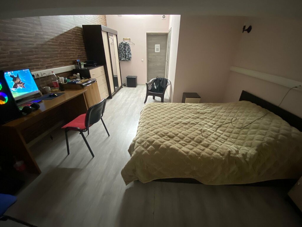 Холодильник в номере, односпальные кровати, горячая вода постоянно, нет проблем со стиркой, доступ 24 часа, курилка в здании, кухня с посудой, метро в пяти минутах, супермаркеты тоже, отчетные документы без проблем Отсутвие окон в номере, отсутствие или плохо работающая вентиляция, нет мест для отдыха вне номеров. Очень советую работникам, кому только ночевать.