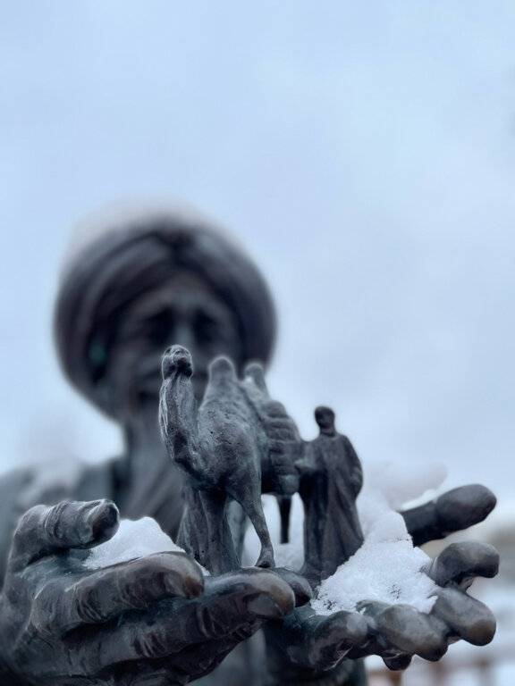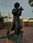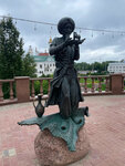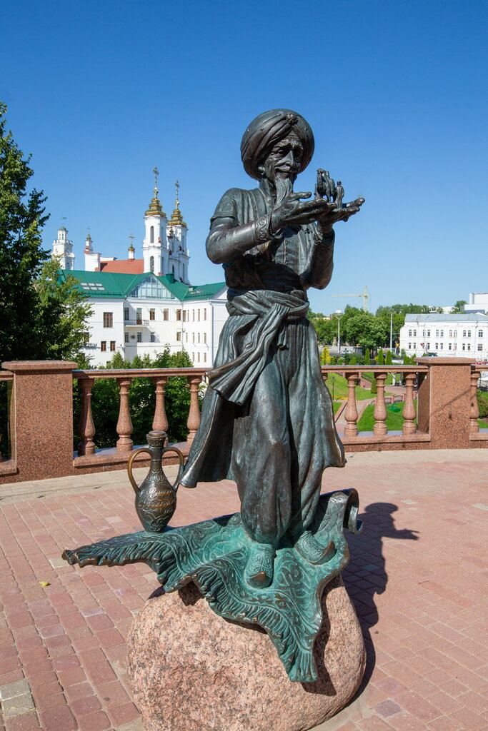 Old man Hottabych and the magic lamp are one of the most unusual and memorable sculptures in Vitebsk. As a gift to Vitebsk and the residents of the city on its 1043rd anniversary, a sculpture of old man Hottabych holding a man with a camel in his hands was installed near the building of the Belarusian Lyalka Theater. Its height is 1.8 meters. The magical hero hovers on a magic carpet near the place where the author of the famous fairy tale once lived.  Lazar Lagin (the pseudonym was formed from the fusion of the first syllables of his real name and surname – Lazar Ginzburg) was born in Vitebsk in 1903 and lived on Podvinskaya Street, later renamed Tolstoy. Now the hero of his fairy tale story, translated into 15 languages of the world, fulfills the wishes of all who touch the magic lamp.