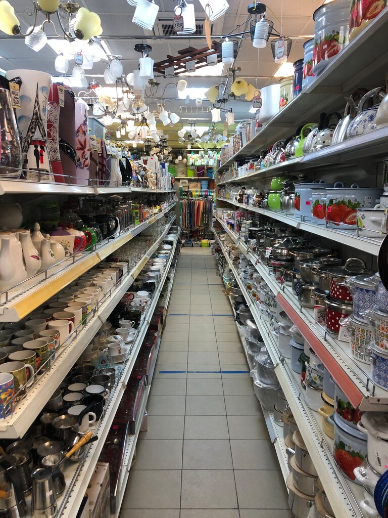 Магазин большой,много стеллажей с посудой,кастрюлями,сковородами,также присутствует в продаже фурнитура для тюлей,штор,крепежи,самоклеивающии крючки,гвоздики и пр. Приобретали пару кастрюль и сотейник салатовый, качество хорошее,продавцы пока без нареканий