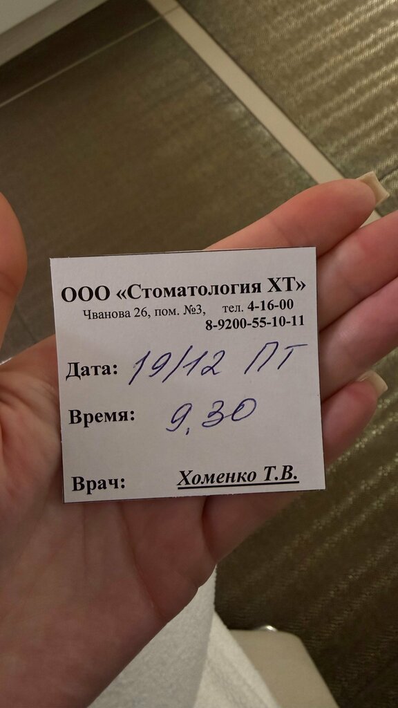 Необходим был срочный ремонт переднего зуба. Зашла на консультацию, посмотрели, дали талон на определенный день и время. Придя в назначенный день ко времени двери были закрыты, указанный тел недоступен, прождала час, никто не появился. Ушла. Спустя несколько часов с того номера тел перезвонили, я стала уточнять, почему так вышло?! Ответ администратора - врач заболела, всем кто был записан я звонила. Вашей записи вообще нет, вы не были записаны!