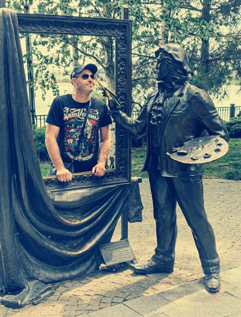 Прикольная скульптура, два в одном! Художник на своём холсте всегда изображает разные сюжеты, в зависимости от времени суток и времени года. А если встать в раму, то художник начинает рисовать именно тебя! Это просто волшебство! Чувствовать себя особенным, как будто сам художник оживает и создает твой уникальный портрет. Обожаю такие милые истории, которые происходят прямо перед твоими глазами!