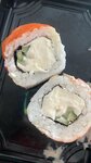 Кол-во: 4 шт.. Вес: 220 г. Рис, водоросли нори, свежий лосось, огурец, творожный сыр, соус спайси, соус терияки, кунжут. Имбирь, васаби, соевый соус входят в состав!