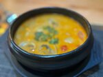 Острый тайский суп с кокосовым молоком, томатами черри, грибами, пекинской капустой и кинзой. Подается с рисом