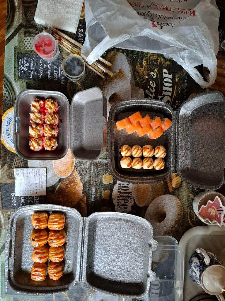 Приобрели сет роллов ( Запечённый) И две пиццы ( 4 сыра , пеперони ) Все было очень вкусно , роллы большие с вкусной шапкой . Пиццы были горячие , сыр тянется , пеперони не пожалели ! Очень все вкусно , будем заказывать еще .