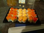 16 шт. Вес: 520 гр. Состав: рис, нори, сыр сливочно-творожный, лосось, манго, кунжут, кляр, панировочные сухари, унаги соус, спайси соус, соус манго чили. Комплект (имбирь, васаби и соевый соус) не входит.