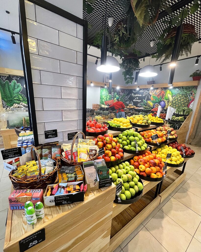 Все очень стильно, чисто, хороший ассортимент, приветливые продавцы. Есть бесплатная доставка даже пучка зелени. Кстати зелень под орошением, очень свежая. Есть возможность онлайн заказа.