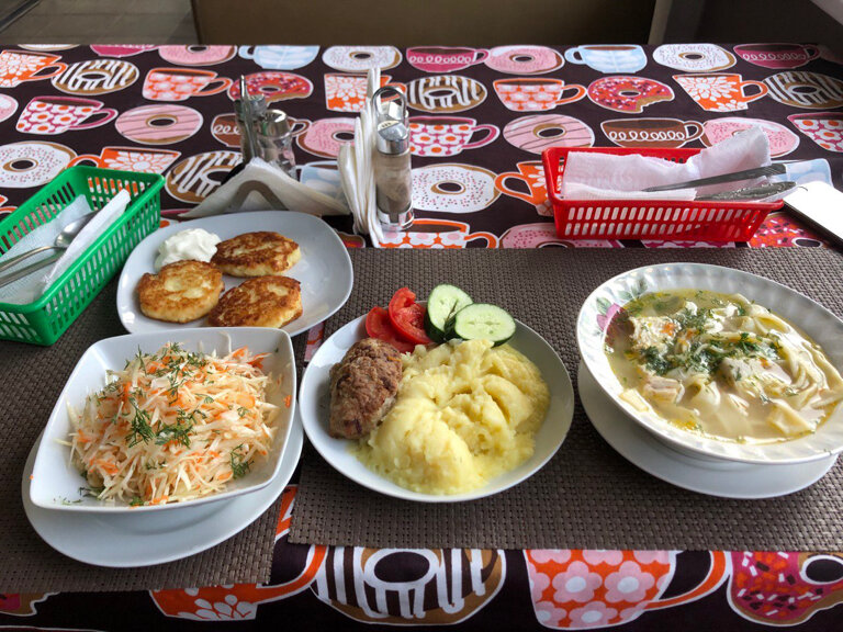 в плове был волос, фаршированные перцы-просто ужас, котлету по домашнему есть невозможно, квас вообще не квас, борщ 3/5, лимонад в бутылке - хороший 👍 ( но открывашка для него просто треш…) плов доедать не стали…