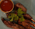 Баклажаны, сыр сулугуни в панировке, крахмал, кунжут, кинза, укроп, соус: сладкий чили