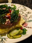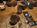 Икра из белых грибов с грибной сметаной, спаржей из Иван-Чая, отборными опятами и чипсами из льна 140г/690₽ Если коротко о вкусе и текстуре, то это грибной микс со сметаной и хрустким маринованным луком. Сметану высокой жирности взбивают до консистенции крема, замешивают в неё грибы, выкладывают на тарелку, а на получившуюся подушку - слой белых грибов, затем спаржу из Иван-Чая с едва заметной кислинкой и маленькие аккуратненькие крепенькие опята. Финальный штрих - чипсы из льна и семечек укропа с характерным вкусом и ароматом, похожим на мяту. Не сразу поняла, что это укроп, вернее не так, понять, поняла, но я не помню, когда он мне попадался в таком виде, поэтому сомнения были. Вкус блюда сдержанный, и если бы в сметану добавили ещё чуть-чуть соли, вот тогда бы я сказала, что он округлый. С другой стороны, соль на столе, поэтому вопросов нет. Вкусно! Если делить блюда на ресторанные и домашние, то 100% - это первое. При кажущейся простоте, в гостях вы такую версию икры не получите, да и дома не повторите, поленитесь. Свиная шея с капустами на углях с пряным соусом 380г/980₽ Шею маринуют в аджике, майонезе и маринованном луке около 12 часов. Затем запекают на углях. Мясо получается упругое, плотное, но податливое, наконец-то можно вспомнить для чего Господь даровал людям зубы, и жевать, получая удовольствие от процесса. А то все эти сувидные мясные истории на один вкус и текстуру (в каждом втором ресторане страны) порядком надоели. Белокочанную капусту тоже запекают на углях, затем томят в мясном соусе. Капусту брокколи обжигают. Добавляют ей остринки. При подаче капусту поливают глазурью из лука. Чтобы её получить, запекают 20 кг лука (понятно, что это не для одной порции), затем выжимают и вываривают до загущения, ничего не добавляя, полагаясь на природный баланс кислот и сахаров. Соуса по вкусу три, все они на основе демигласа - от сладкого к горьковатому (через соль), один из них - стейк-салат с цитрусовыми нотами. И всё это на одной тарелке. Таким образом мы, гости, получаем в каждой вилке новое блюдо. Девочкам можно брать на двоих - мяса очень много! Блюдо идеально подходит для новогодних корпоративов, есть в нем какая-то зимняя рачительность и праздничная щедрость. Вкусно! Томлёная утка с белыми грибами, черносливом и тыквенным кремом 370г/1390₽ Ну, во-первых, это красиво, особенно в такую погоду, когда уже и листьев нет, а снег ещё не выпал. Спасибо шефу за эстетическое удовольствие и тепло осенних красок! Во-вторых, здесь опять простые и понятные локальные продукты. В тыквенном креме только тыква и это плюс. Плюс чистого вкуса. Утку и белые грибы томили в жиру (с добавлением костного мозга), который собирают с демигласа (в процессе приготовления соус обезжиривают, а жир используют в приготовлении других блюд). В итоге мы, гости, имеем максимально насыщенный мясной вкус утки, красивое, красное, достаточно сочное и нежное мясо, распадающееся на волокна, а не на молекулы (это я опять про сувид). Очень похоже на утку конфи. Чернослив, спасибо, тоже не растомили до фруктовой каши, его текстура идеально упруга, но мягка. Грибы, на мой взгляд, особой роли не сыграли, можно было обойтись и без них (честно говоря, хотелось другой текстуры, вешенок, может быть, но шеф видит блюдо иначе). Утку подают с соусом на основе вымоченного чернослива. Блюдо украшают слайсами маринованного 