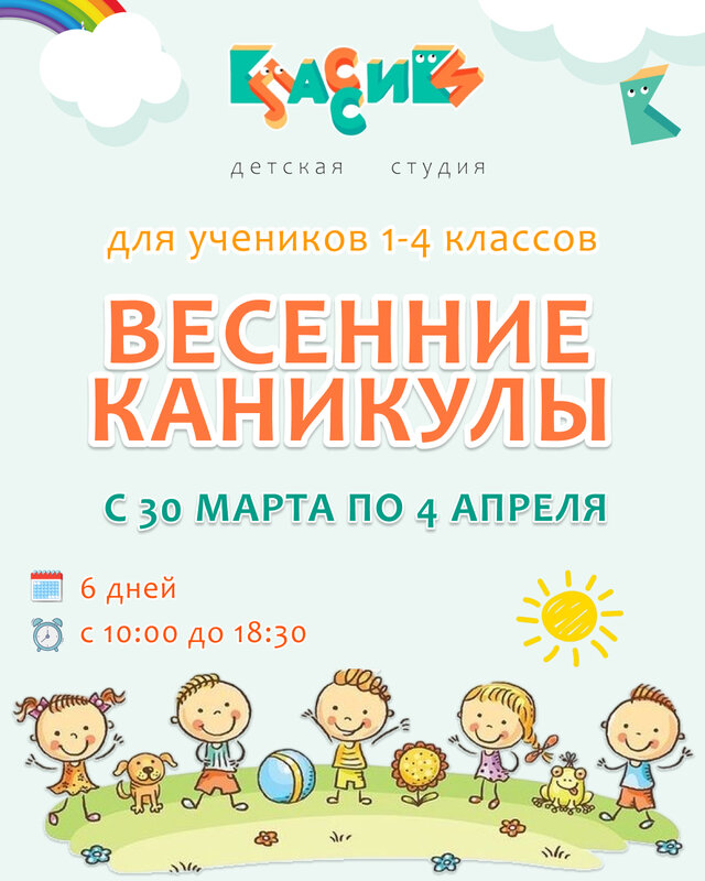 Классики открывают весенний набор в Детский Клуб для школьников 1-4 классов на период каникул! 🎉 На время отдыха от школы ребят ждут: 🗓️ ...