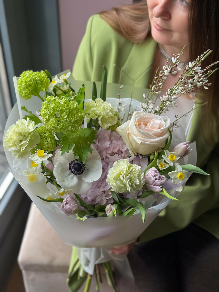 СОСТАВ: гортензия, пионовидные розы, кустовая маттиола, мэвкалипт Букет оформляется дизайнерской пленкой и атласными лентами К букету прилагается авторская инструкция по уходу за цветами ВАЖНО: Мы работаем с редкими сортами растений и цветов и дел...