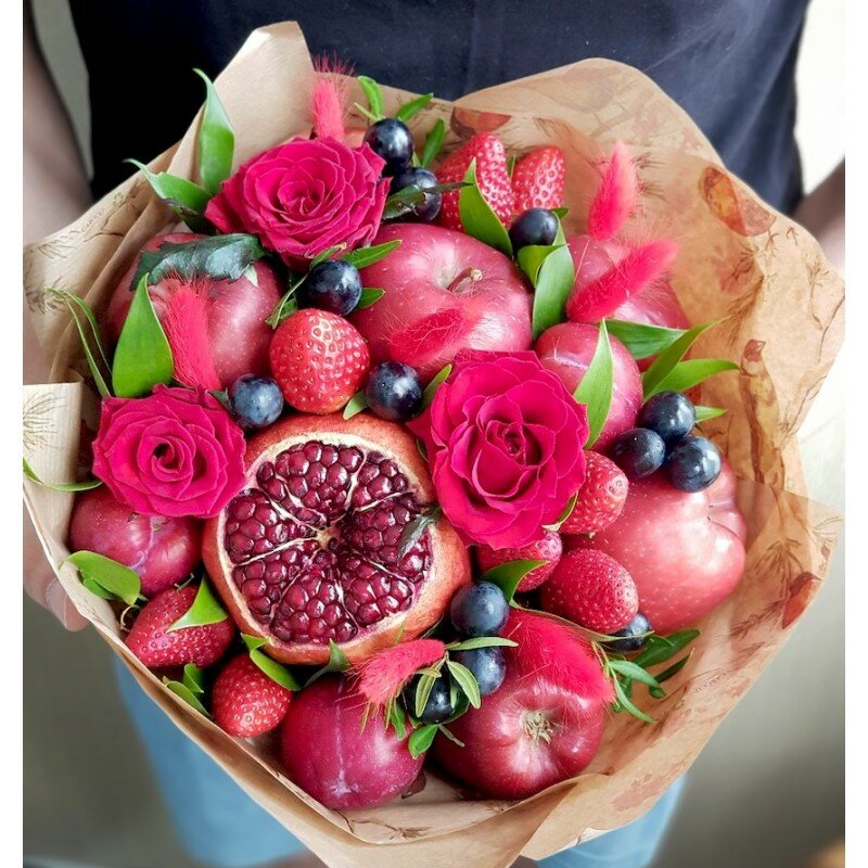 Композиция из живых цветов. Роза премиум класса 5шт, гиперикум-5шт, фисташка-5шт, статица-2шт, эустома 1. Каждая изготавливаемая флористом цветочная композиция является уникальной и может отличаться внешним видом, размером и оттенками цвета. Такж